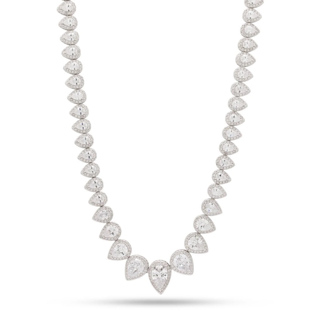 The new Pear Cut Necklace is iced with more than 2,200 stones. The necklace features handset round cut and pear cut VVS Diamond Simulates. The chain is available in 14K Gold plating and white gold plating. It’s available in various lengths for multiple styles.