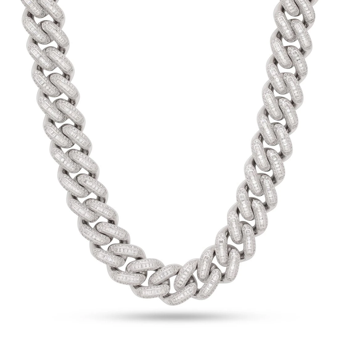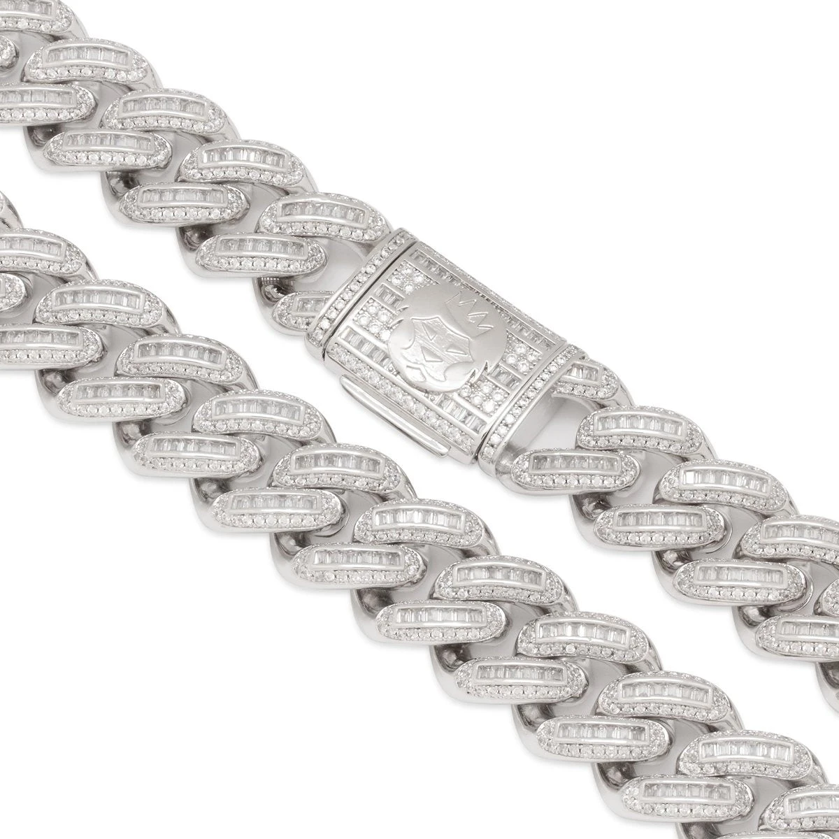 A unique take on the classic Miami Cuban Link Chain. Stones line a full row of Baguette stones on each solid-back link.Â