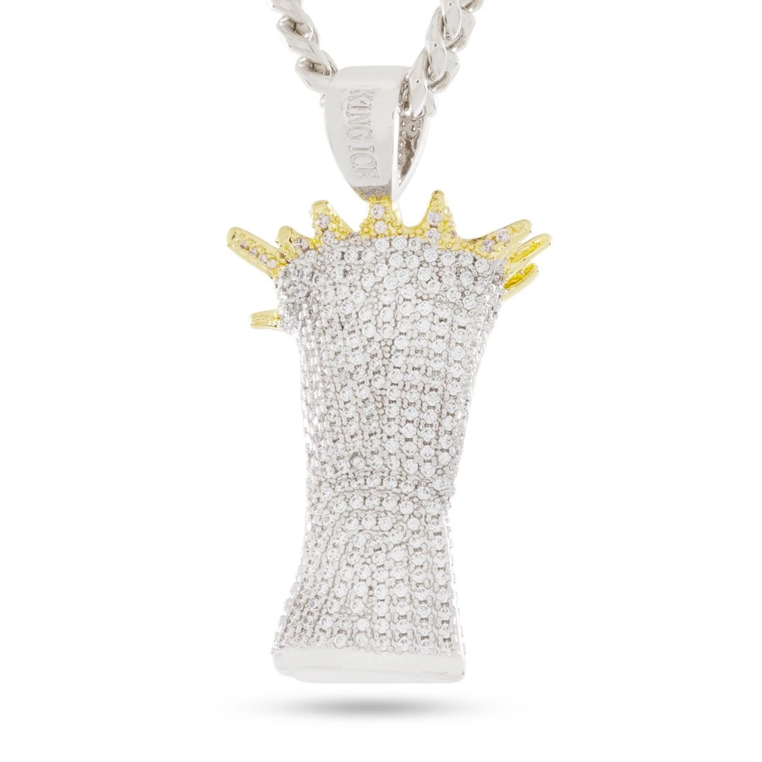 Inspired by sculptures from Norway and Spain, our “3D Boss” necklaces capture a similar effect of accomplishing a fully three-dimensional design with a nearly flat shape. This piece features a Two-Tone Jesus piece, covered in handset stones. This 3D Boss pendant uses a combination of stones and polished metal to achieve multiple layers of depth.