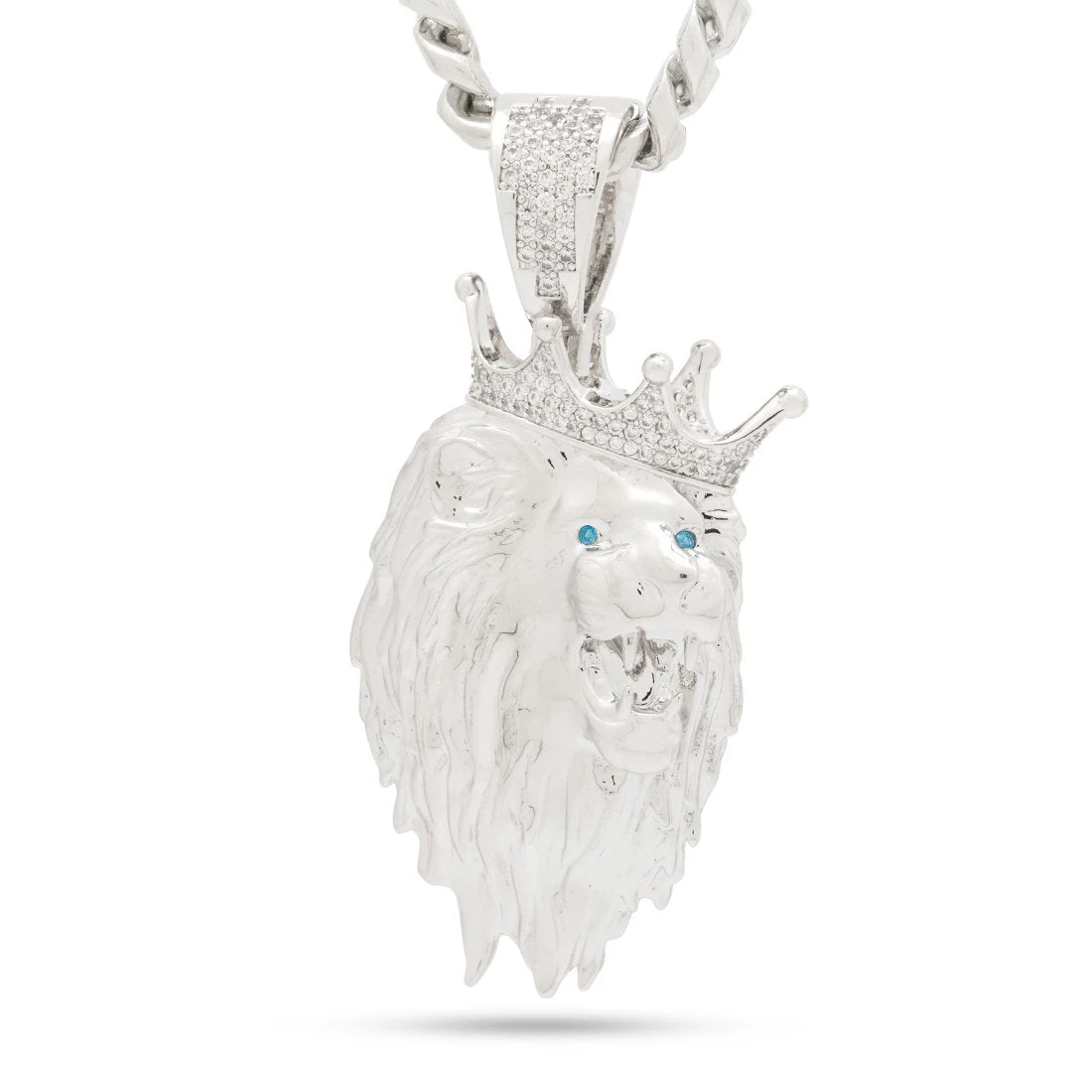 Inspired by sculptures from Norway and Spain, our “3D Boss” necklaces capture a similar effect of accomplishing a fully three-dimensional design with a nearly flat shape. This 3D Boss Roaring Lion features a crown, fully wrapped crown of brilliant stones, distinctive blue eyes, and completed with an iced bail.
