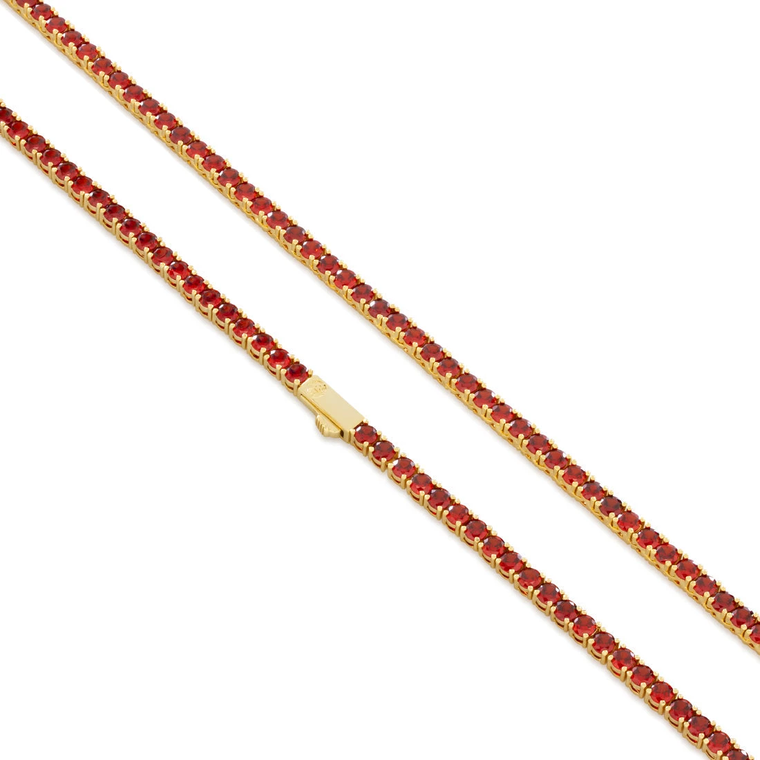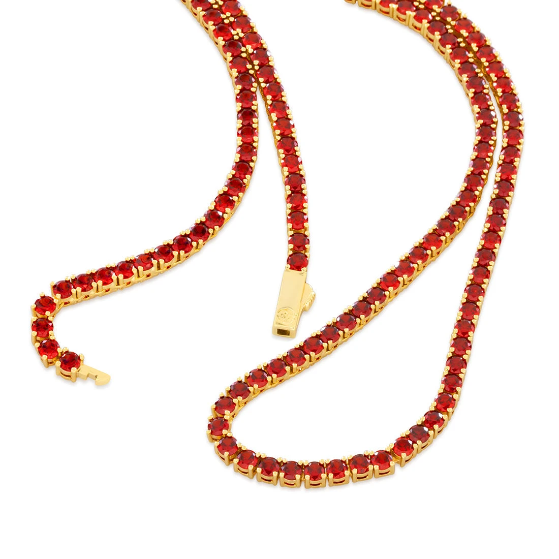 Dress up your street style with our 4mm Ruby Tennis Chain from King Ice, featuring bold red stones. This chain is a statement-maker, adding a fierce edge to your look. Rock it with confidence and turn heads wherever you go. Grab yours now and level up your streetwear game.