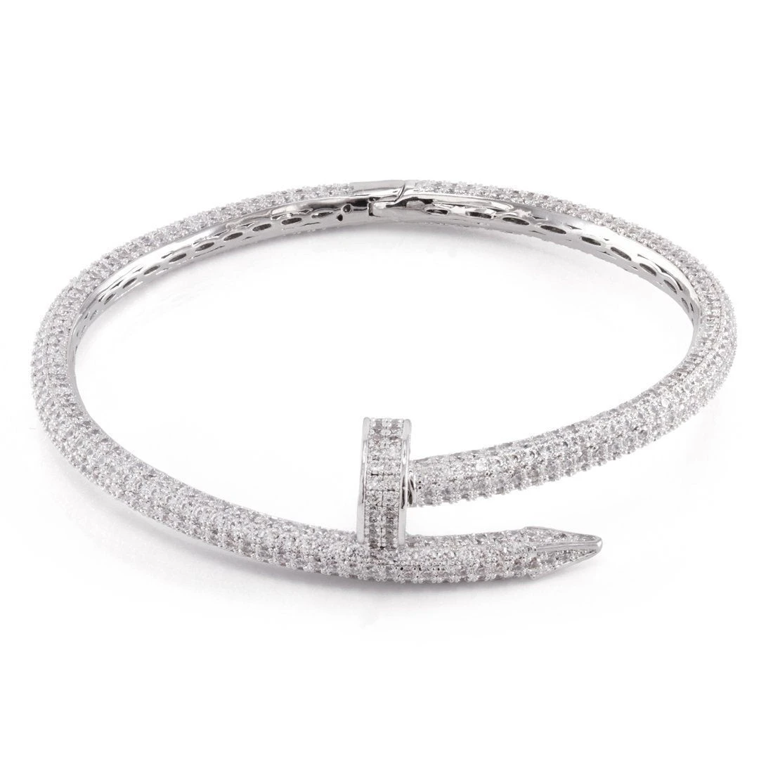 Plated to perfection, each Iced Studded Nail Bracelet comes lined with VVS Diamond Simulate Stones to provide a classic look. Available plated in 14K Gold or White Gold.