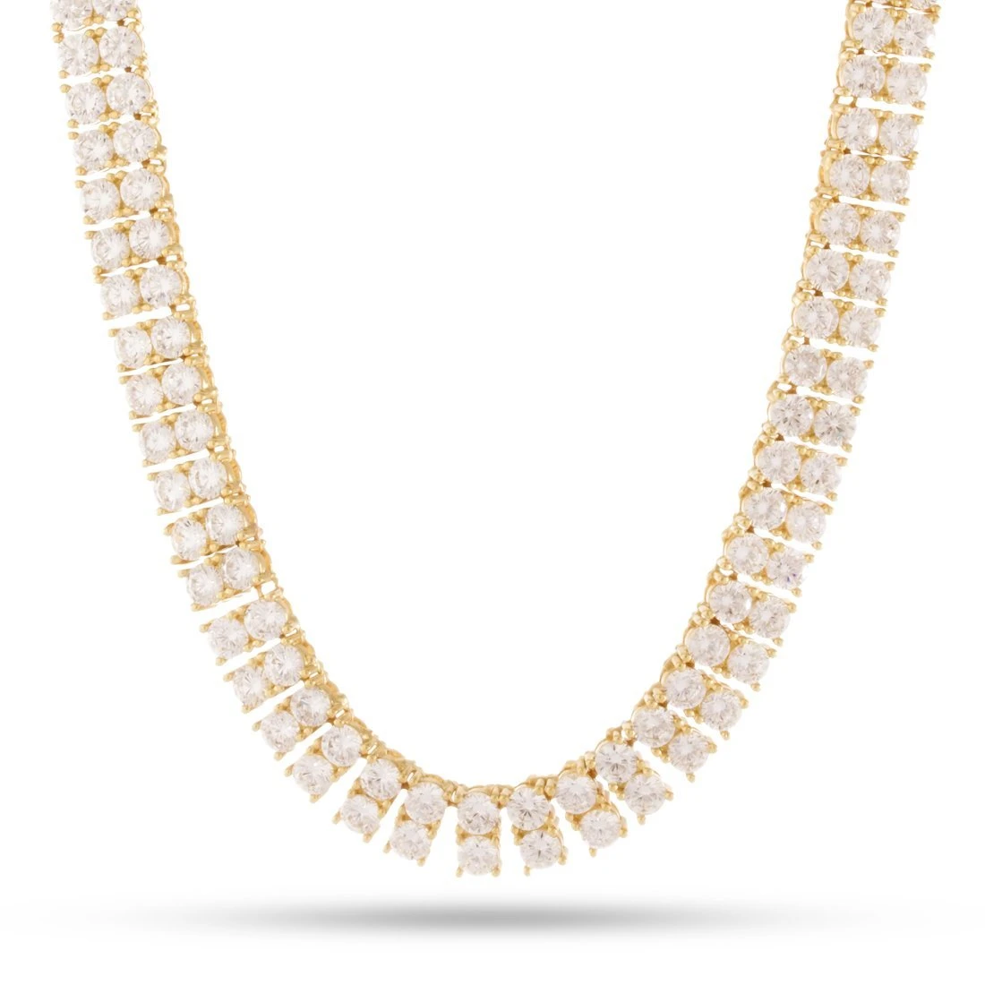 Providing a large, sophisticated look is this 8mm chain includes two-rows of clear, round-cut VVS Diamond Simulate stones that pop in light. Each stone comes placed on a prong setting for added security and durability and is available in 14K gold plating or white gold plating.