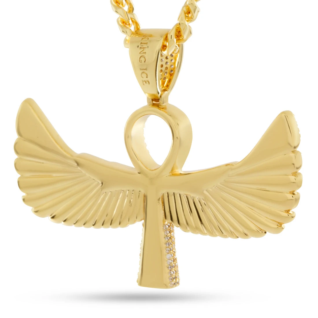 This luxurious necklace is the perfect addition to any collection. Crafted with the highest quality gold, it features the iconic Ankh and wings of Isis that is sure to turn heads. The design draws inspiration from ancient Egyptian iconography, making it one of a kind piece of hip hop jewelry.