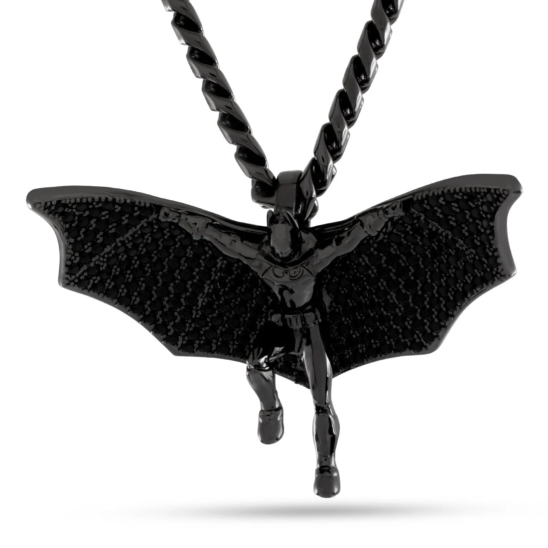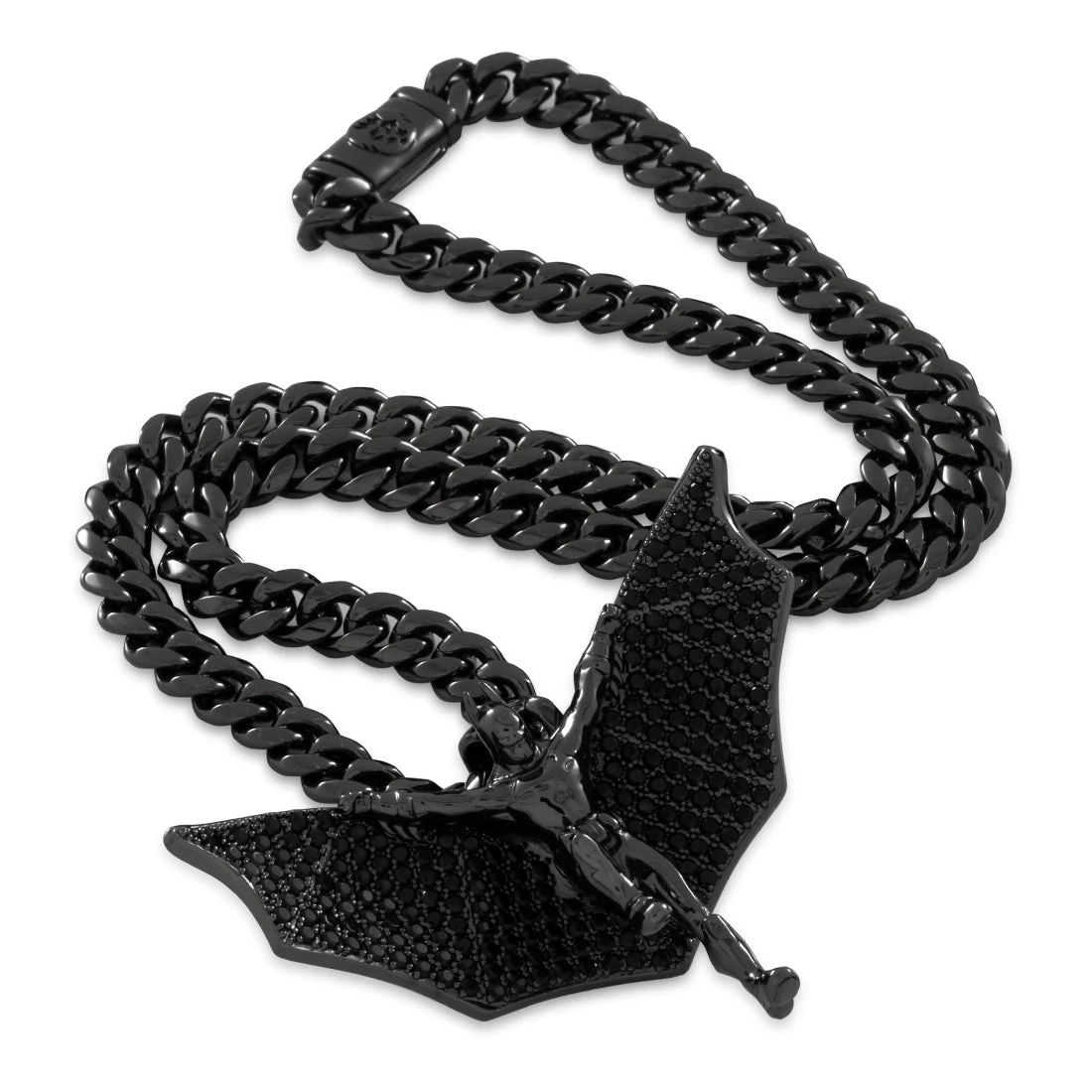 Our Batman Necklace features the glider cape, first seen on the second Batsuite. This piece uses hundreds of stones to create contrast between Batman and the cape on a full 360 design.