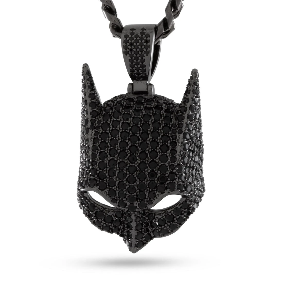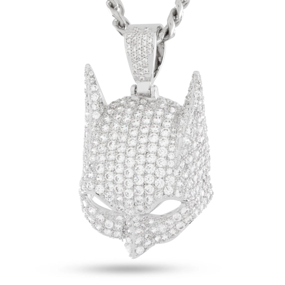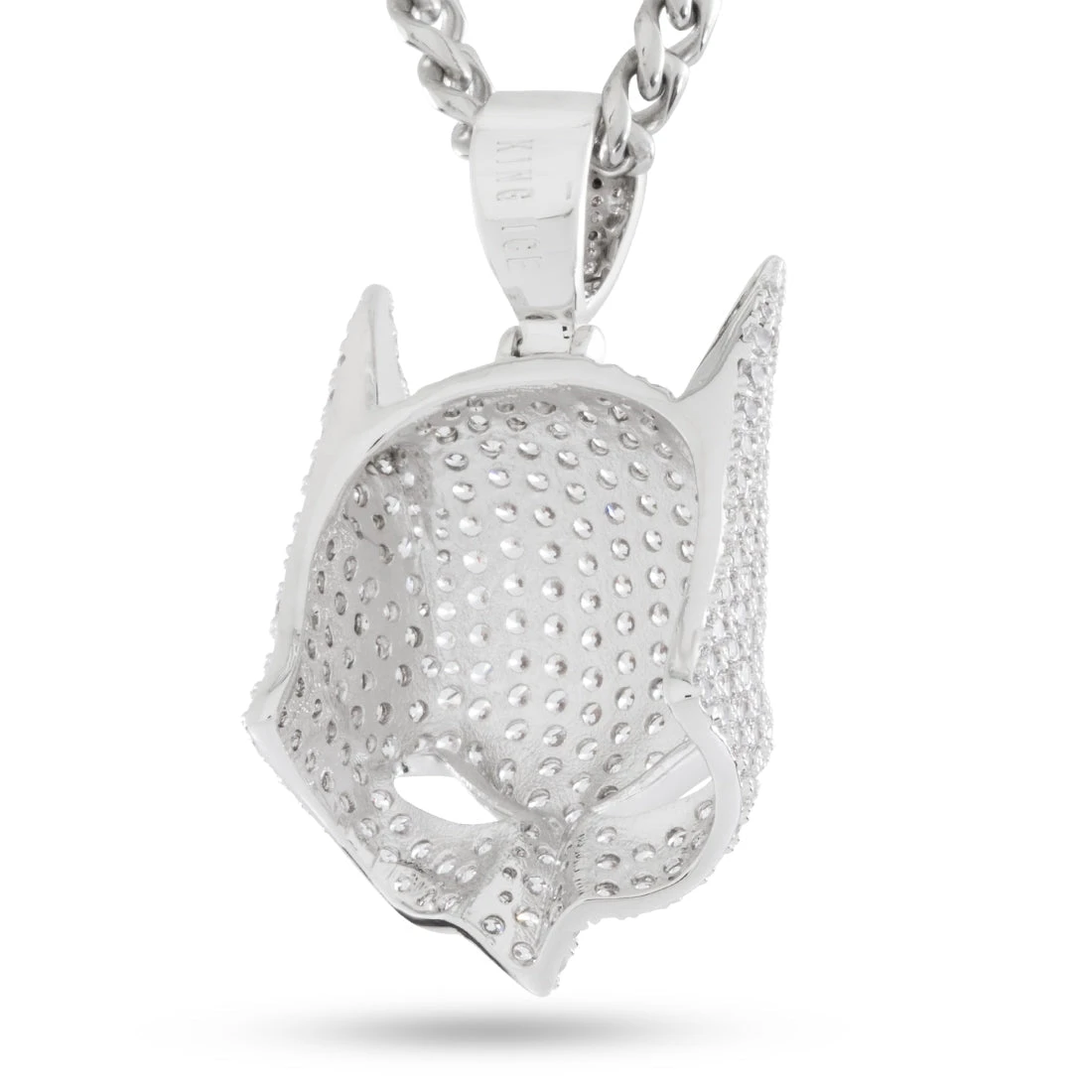 Batman’s Cowl has seen many versions over the years. A full face of stones line the angular and curved surfaces. This piece features open eyes that allow light to pass through and a custom iced bail.