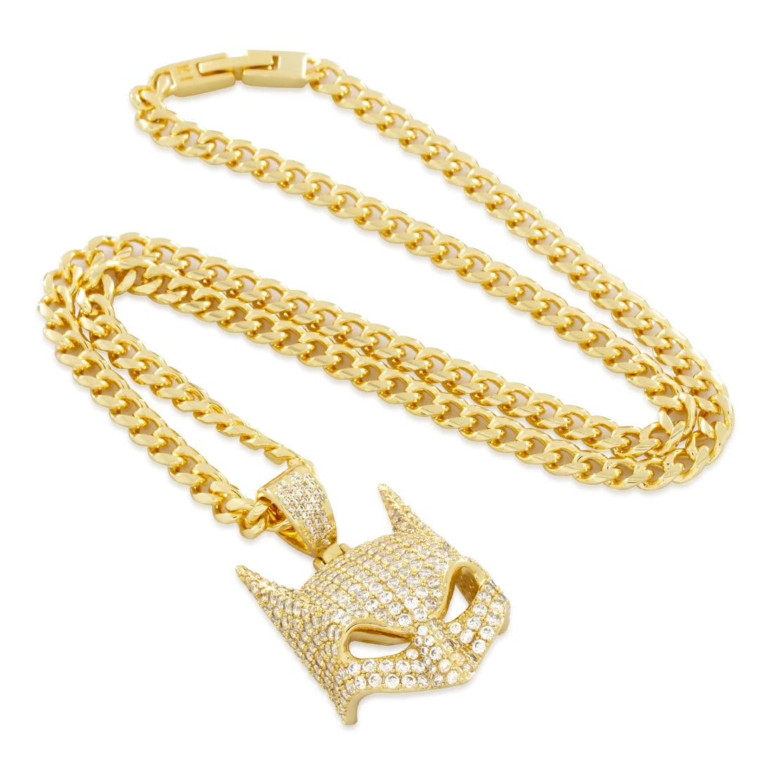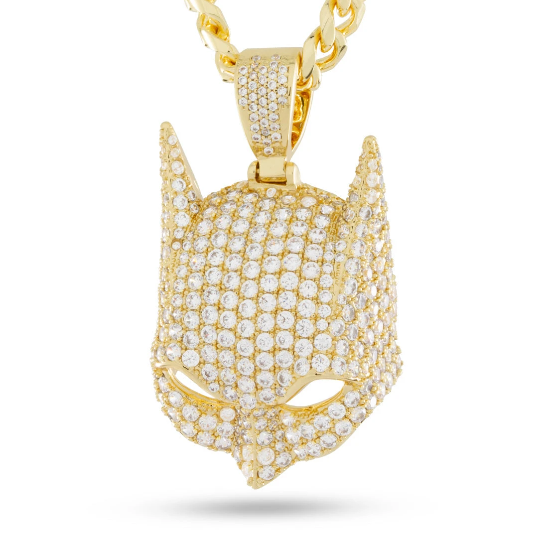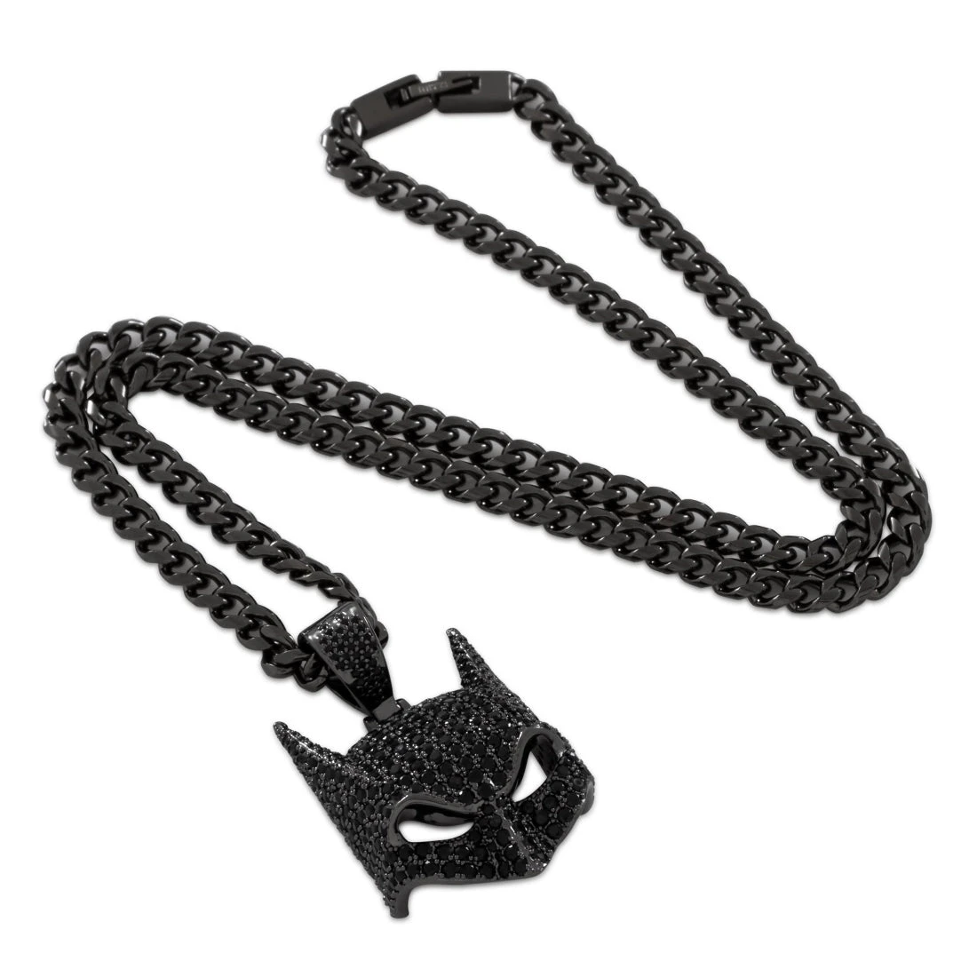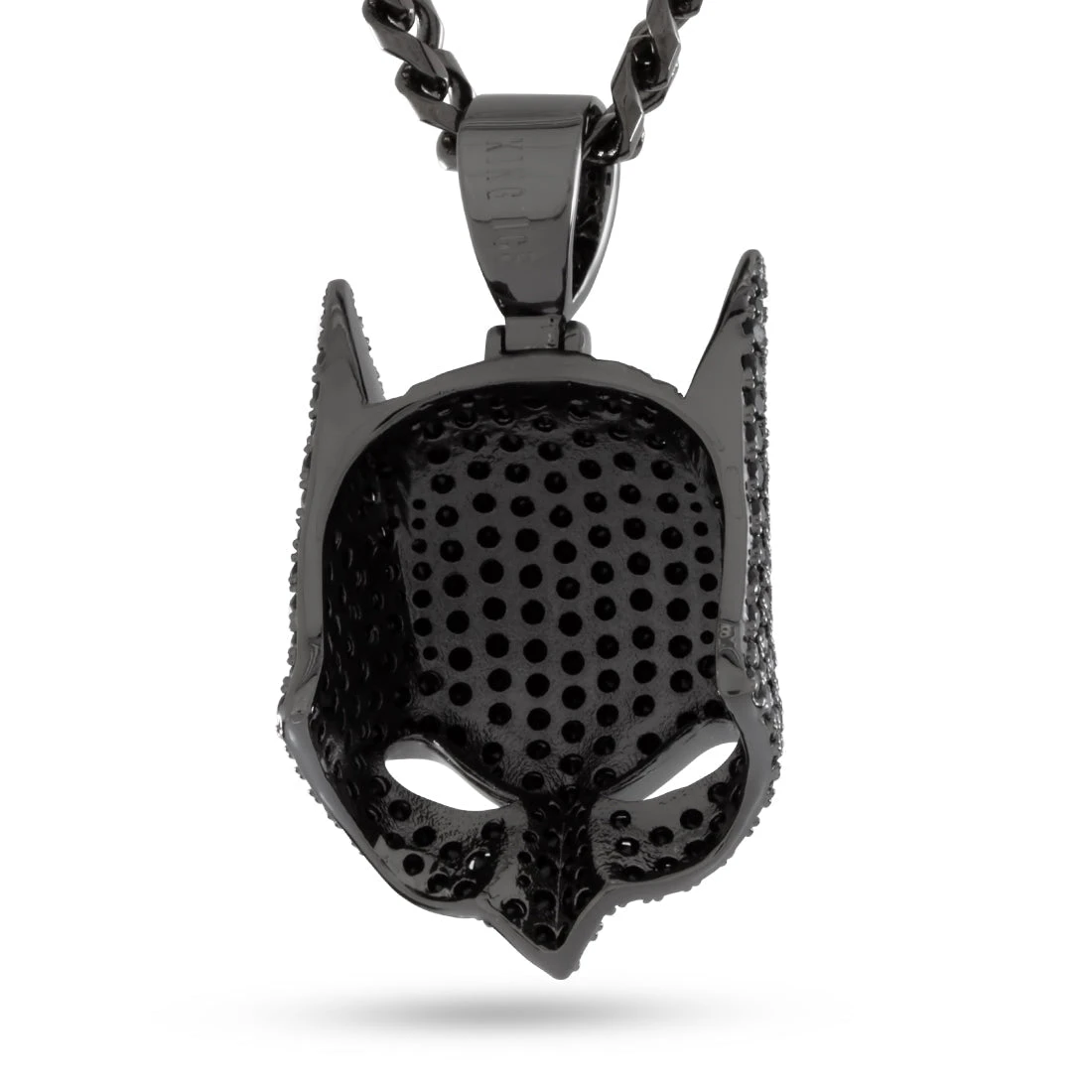 Batman’s Cowl has seen many versions over the years. A full face of stones line the angular and curved surfaces. This piece features open eyes that allow light to pass through and a custom iced bail.