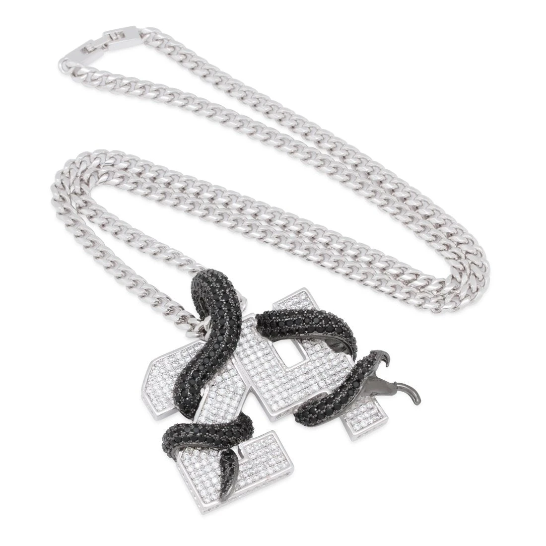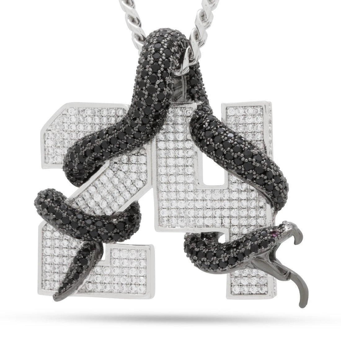 We are proud to release this limited edition collection in commemoration of the late Black Mamba. Featuring wide block lettering adorned with a fully iced black mamba bail integrated into the design, our Number 24 Necklace is one of our most unique.