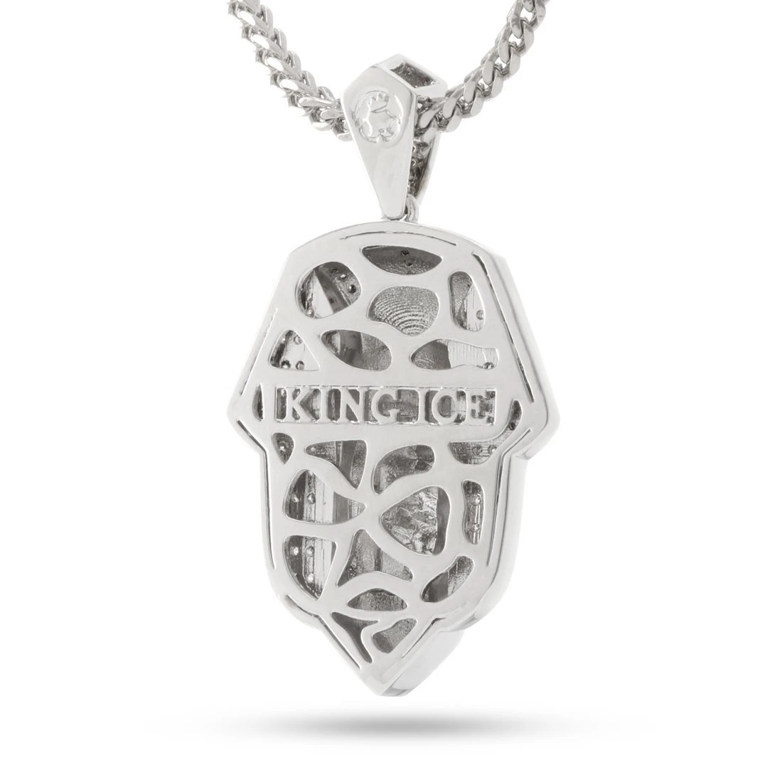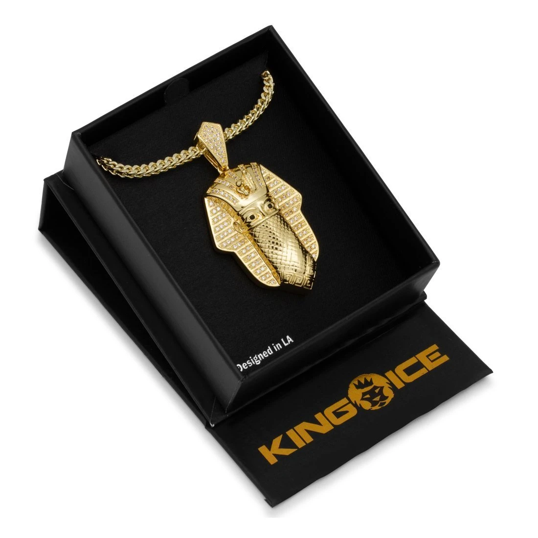 Check out this gold pharaoh rocking a bandana over the lower part of his face. The face is brushed gold with polished gold on the sides and back. Features white CZ stones on a micro pave setting and a King Ice cage in the back. Look closely from behind and you can see the pinholes from where each stone is handset.