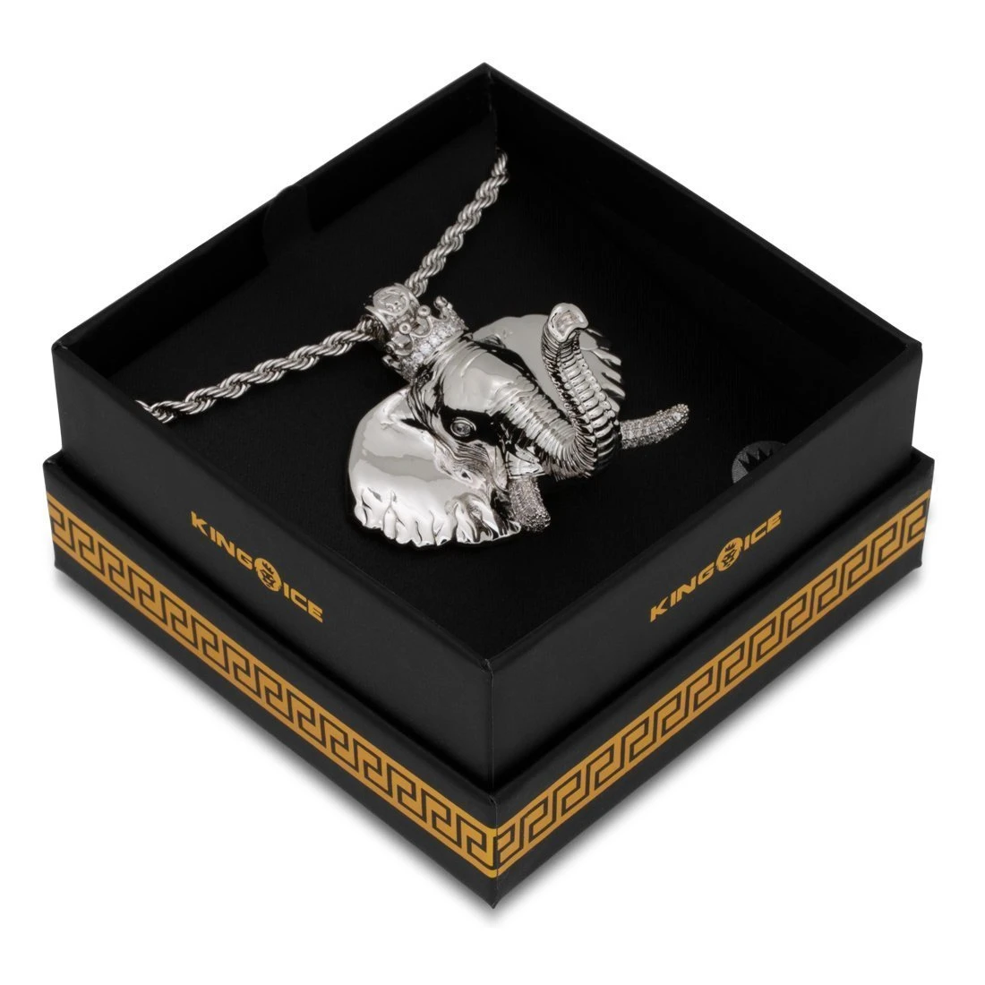 Exotic and powerful, elephants remain worshiped and praised for their tempered nature and grace, you can pay tribute to these mighty creatures. Each elephant features clear CZ stones covering its ivory tusks, while its elegant crown showcases its might and power against other land mammals. Paired with a 4mm Rope Chain.