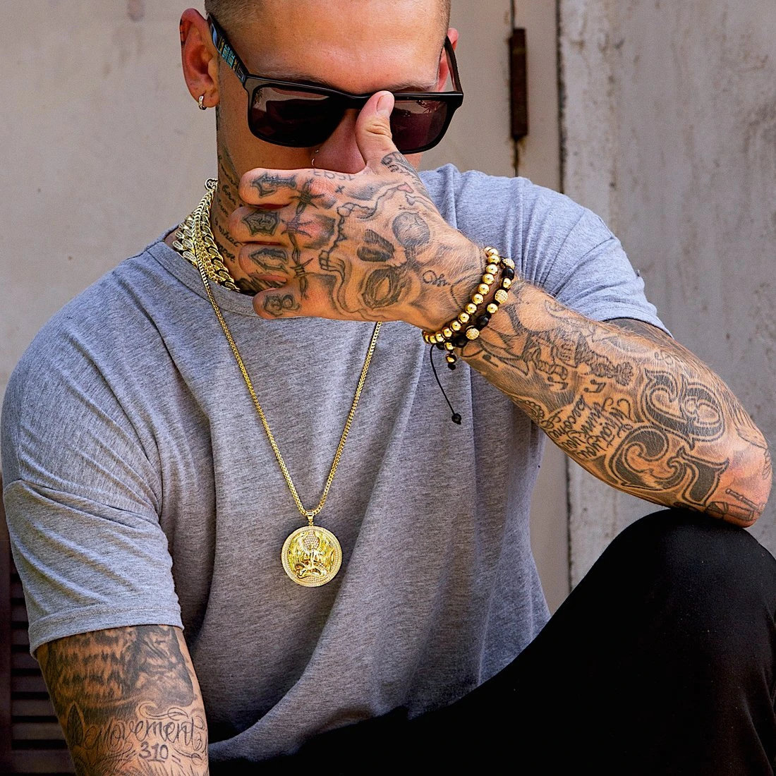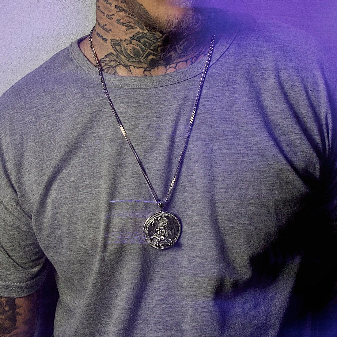 Made from 14K Gold plating and lined with AAA stones. Each Pendant features an angel holding and killing the snake to free itself from its clutches.