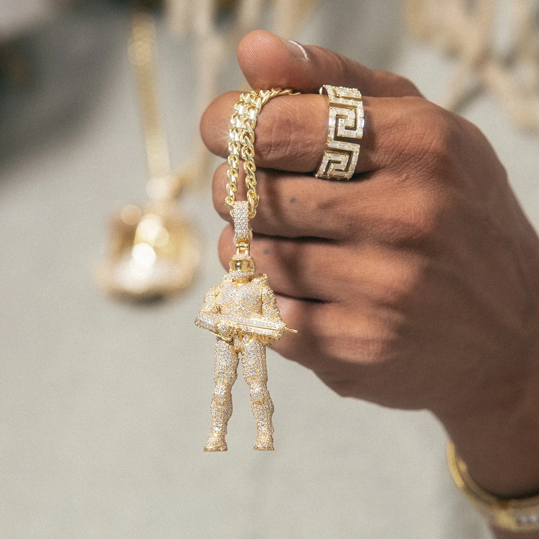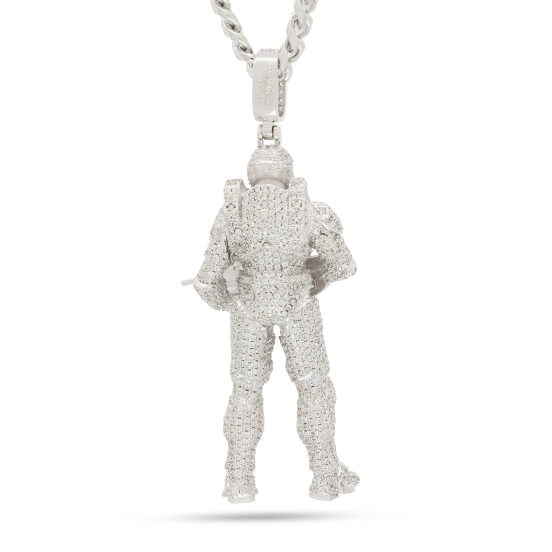 The protagonist of the Halo franchise is one of the iciest pieces we’ve made. Each piece of armor is individually modeled as actual armor would be and covered in over 1,400 stones for 360 degrees of detail.