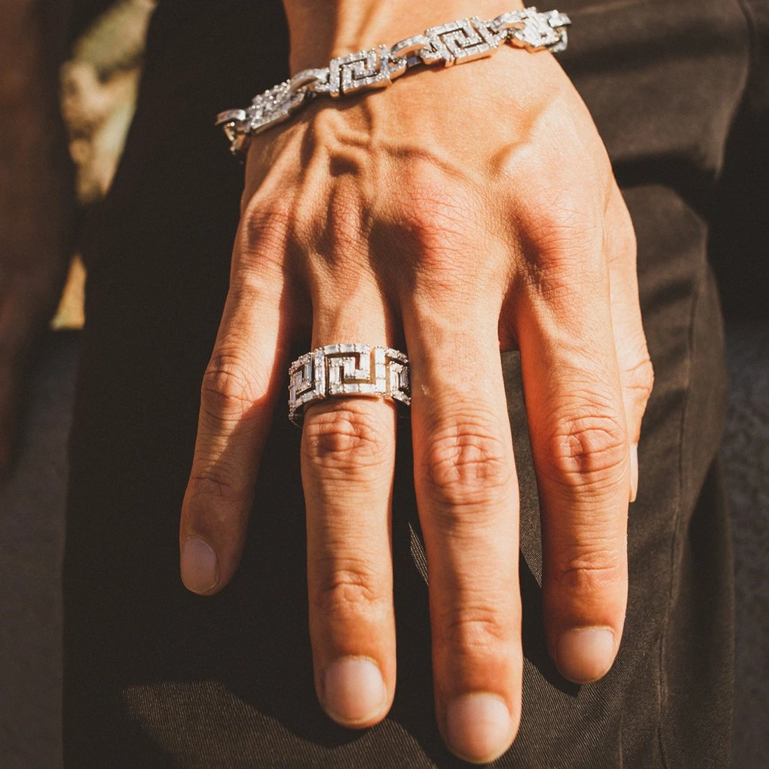 The signature King Ice Greek Key pattern makes up the design of this Iced ring. Baguette stones make up the geometric shape that extends seamlessly around the entire ring for an eye-catching shine from any angle.