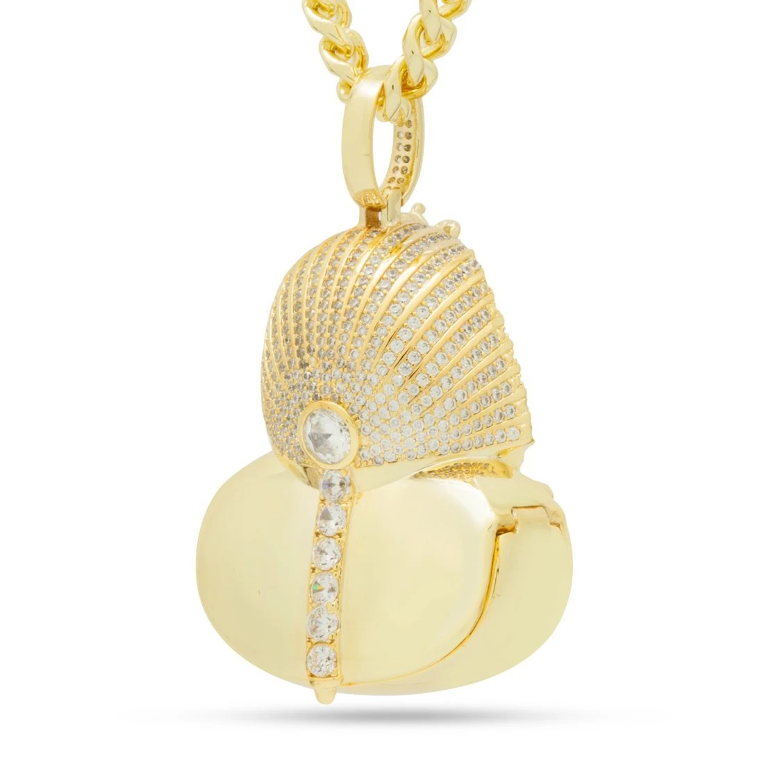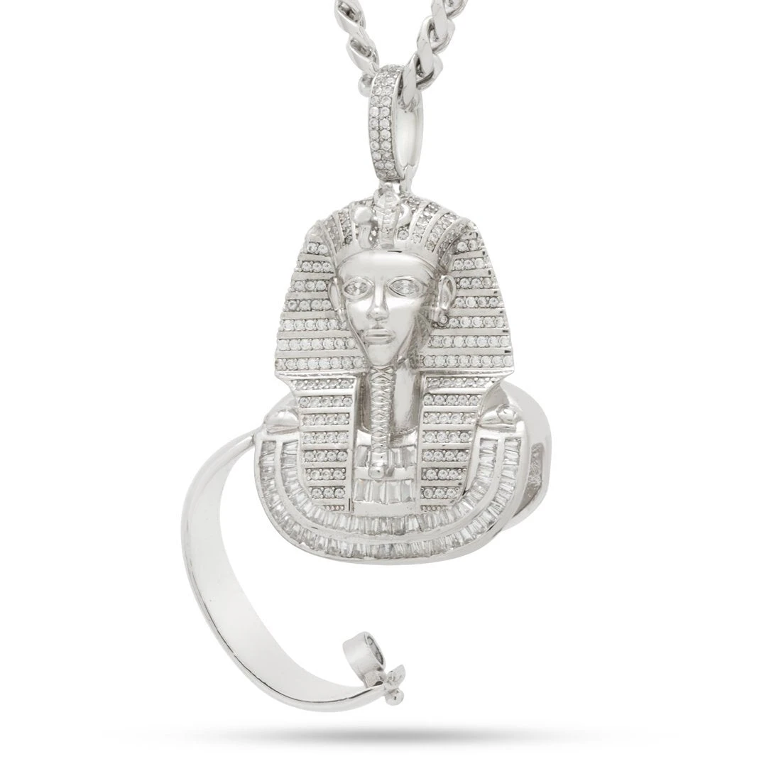 Although King Tut was a pharaoh in an Egyptian dynasty, he is widely recognized for the tomb he was buried in. Available in 14K Gold and white gold, we have replicated King Tut’s tomb to include a secret stash to hide your “valuables.” This new version of the necklace has more baguette-cut VVS Diamond Simulates on the King’s garment. Paired with a 5mm Miami Cuban Chain.
