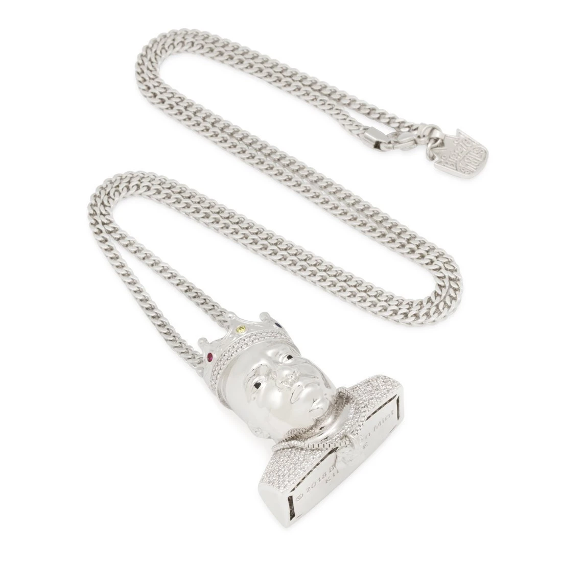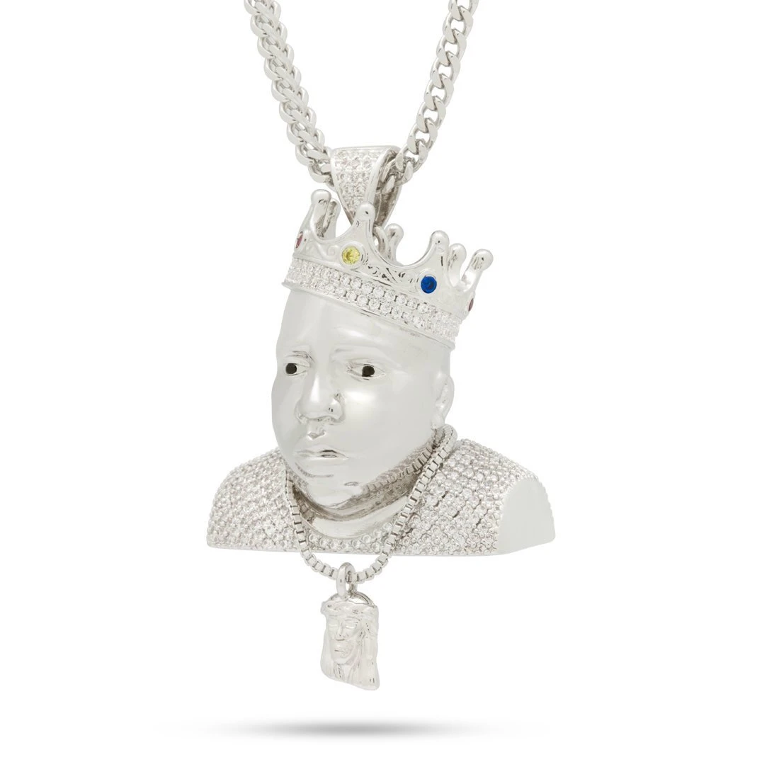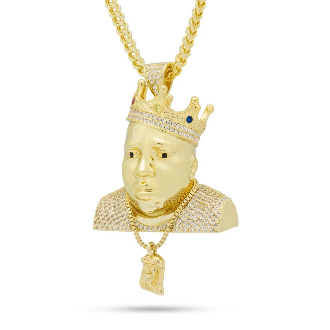 As one of the greatest hip hop artists ever, The Big Poppa necklace pays homage to the Notorious B.I.G. with his famous tilted crown image. Each piece is re-imagined in 3-D with either 14K Gold plating or white gold plating and CZ stones for a stunning and vibrant display of street wear jewelry. The pendant, which includes a Jesus piece of its own, includes a 2.5mm, 20″ Stainless Steel Franco Chain.