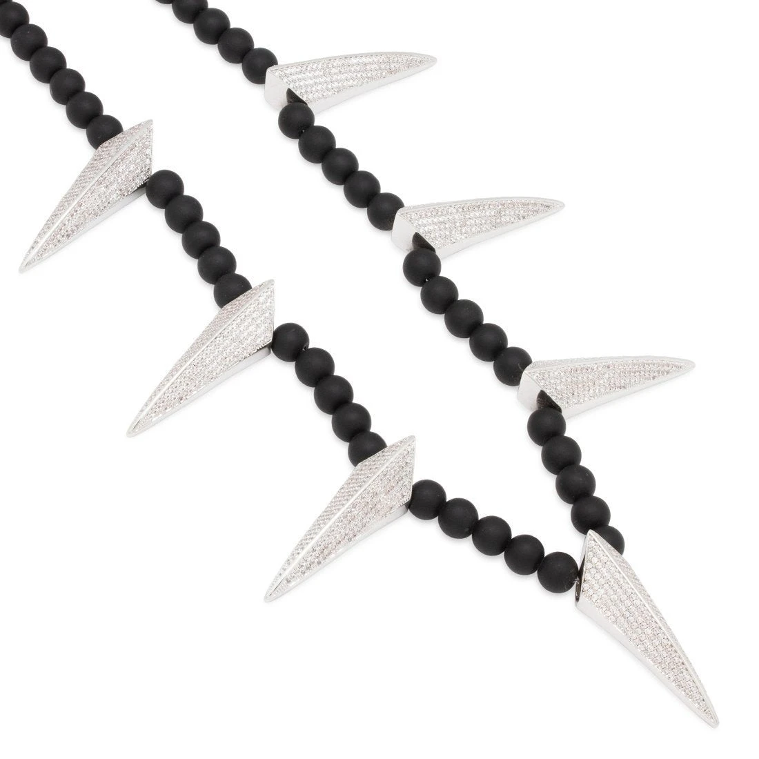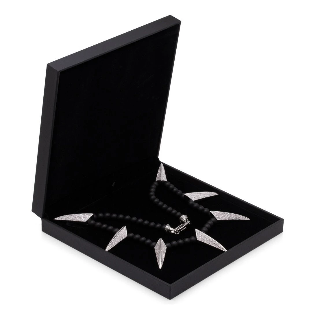 With semi precious, matte-finished Onyx gemstones, the Wakanda inspired necklace mixes street and contemporary that brings versatility to any ensemble. Iced with VVS Diamond Simulate stones and available in 14K gold plating or white gold plating stainless steel.