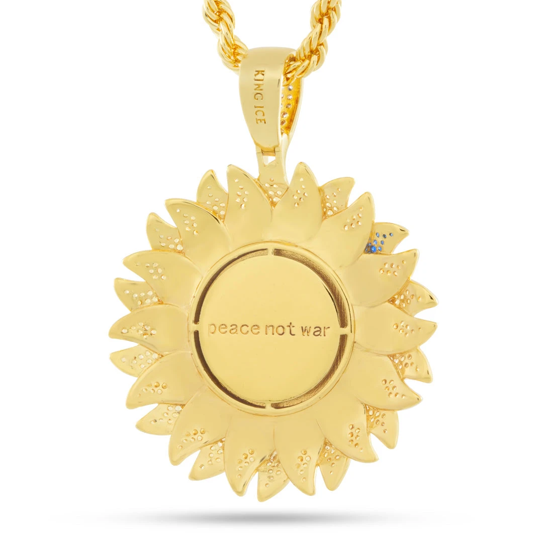A sunflower, Ukraine’s national flower, has become a widely recognized symbol of resistance, unity, and hope against the Russian invasion of the country. This piece features a multi-finish iced peace symbol. Each petal is individually cast with stones that follow the organic shapes that add an incredible amount of detail. The blue petal, amongst the yellow, represents the Ukrainian flag. #StandWithUkraine
