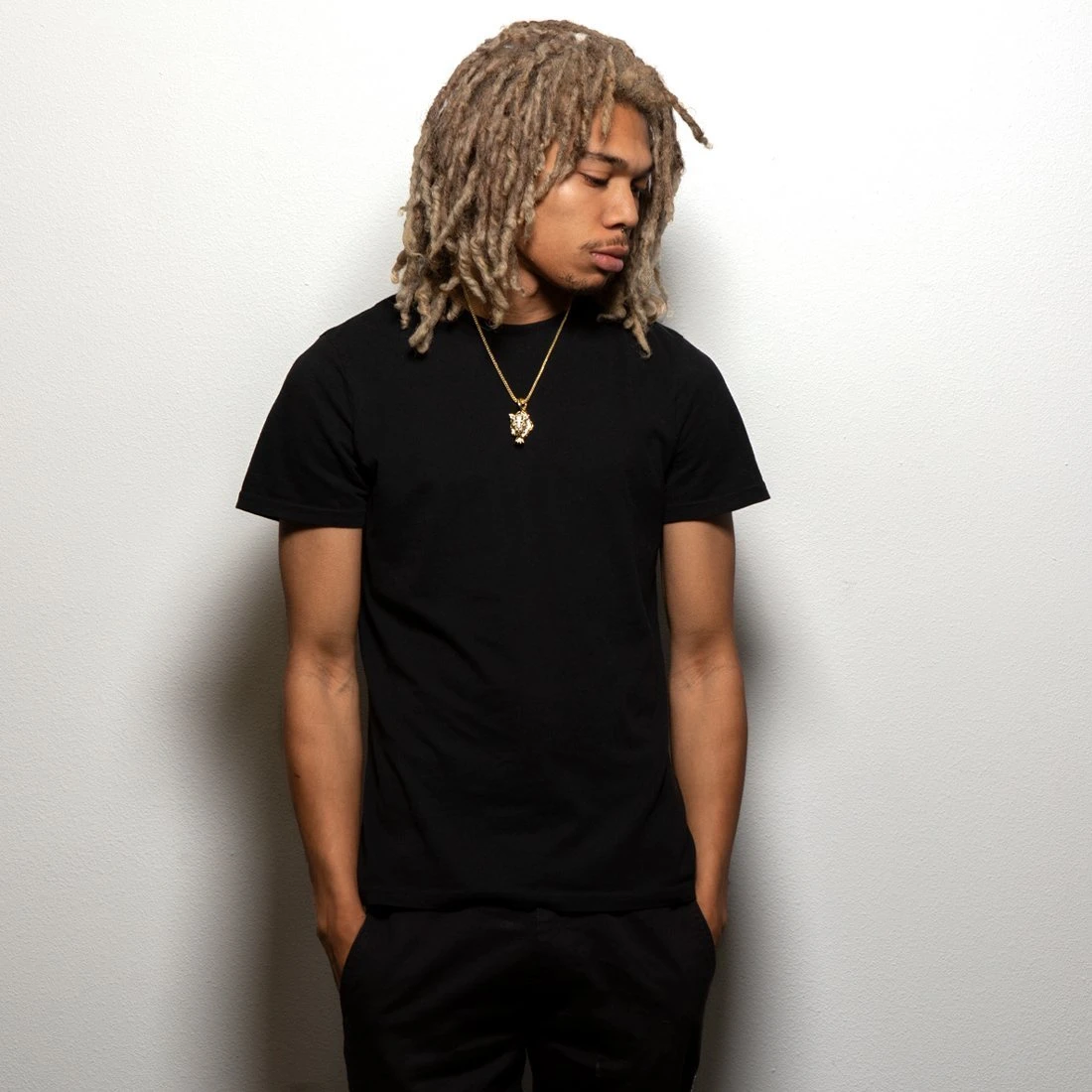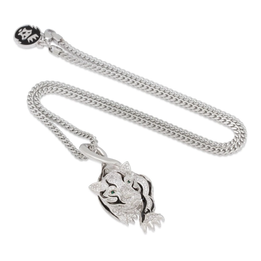 Panthers represent strength and power. They’re strong, quick, and always on the prowl. This design is a silhouette of a panther with dark and deep outlines of the body covered with black enamel. The new Prowl Panther Pendant comes iced with VVS Diamond Simulates. Each pendant is plated with 14K Gold or white gold. Paired with a 2.5mm Franco Chain.