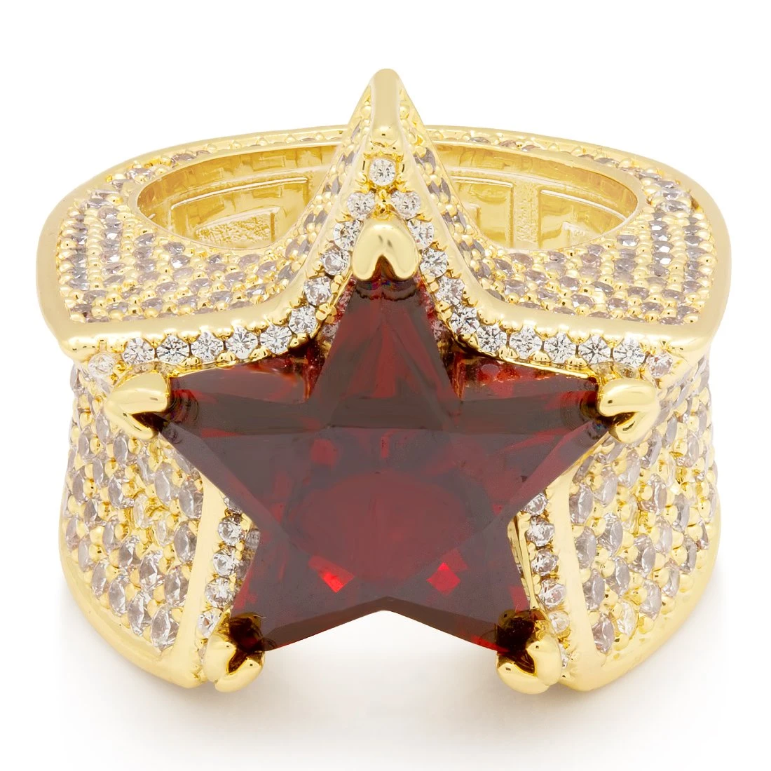 The Ruby Star Ring features a bold, red, star-shaped stone surrounded by hundreds of handset white stones that catch light from every angle. The band has an inner greek-key pattern leaving every surface of the ring detailed.