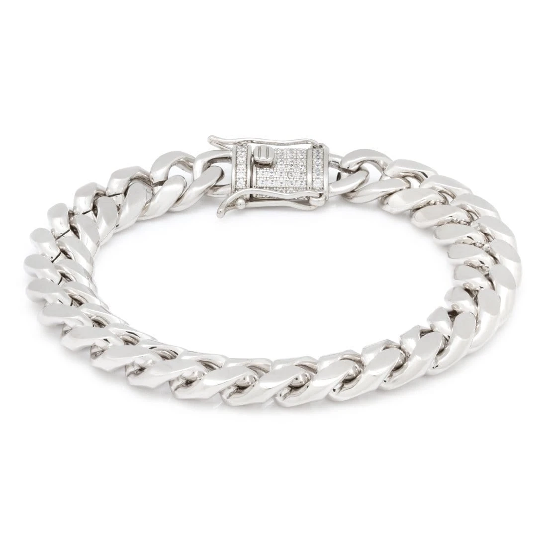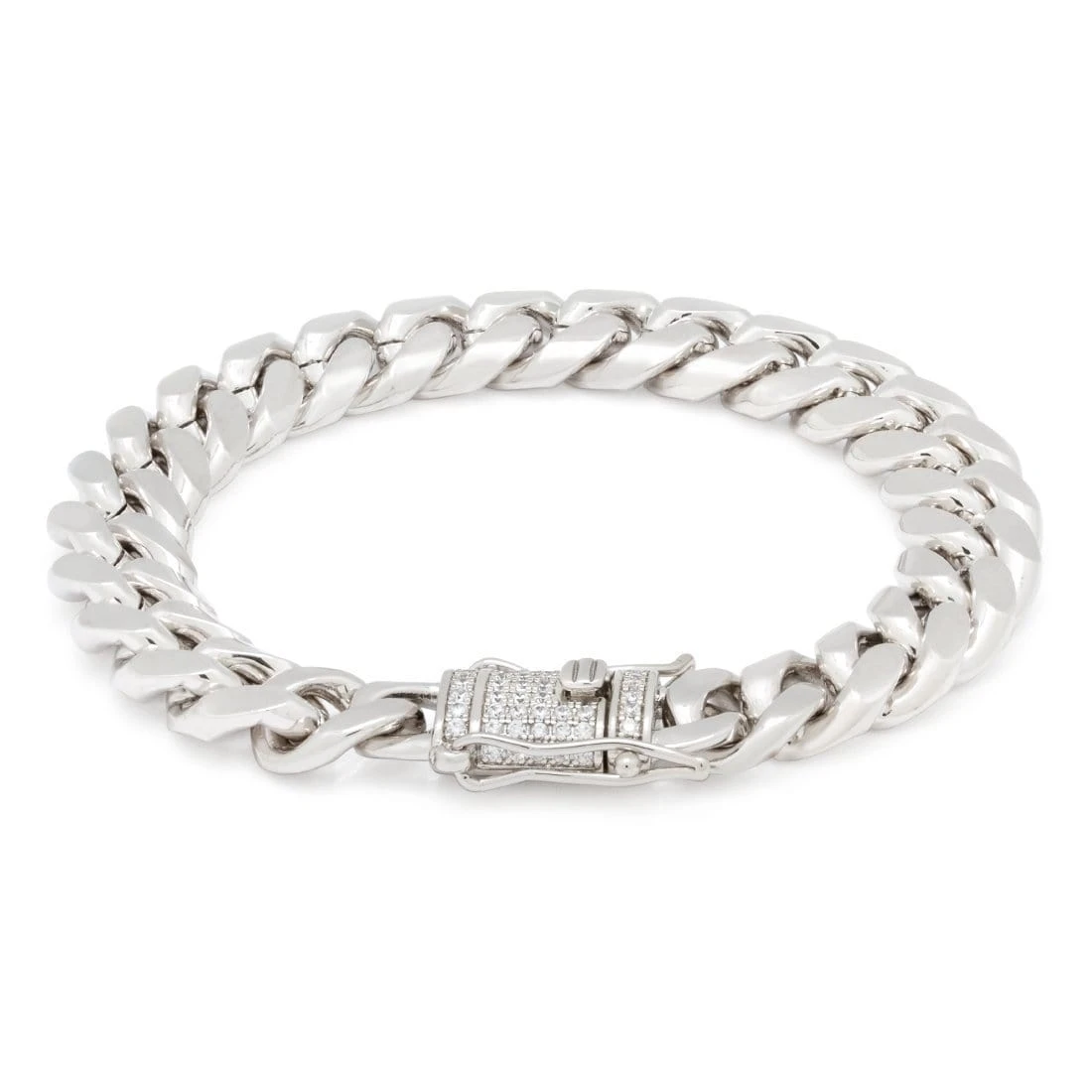 This 14K Gold plated Miami Cuban Link chain bracelet matches perfectly with a Miami Cuban Link chain. Each thick, 10mm link is rounded and connected to provide a sleek, stylish look. With an updated tongue-box clasp iced with handset CZ stones, you’ll find it easier to wear and remove this bracelet.