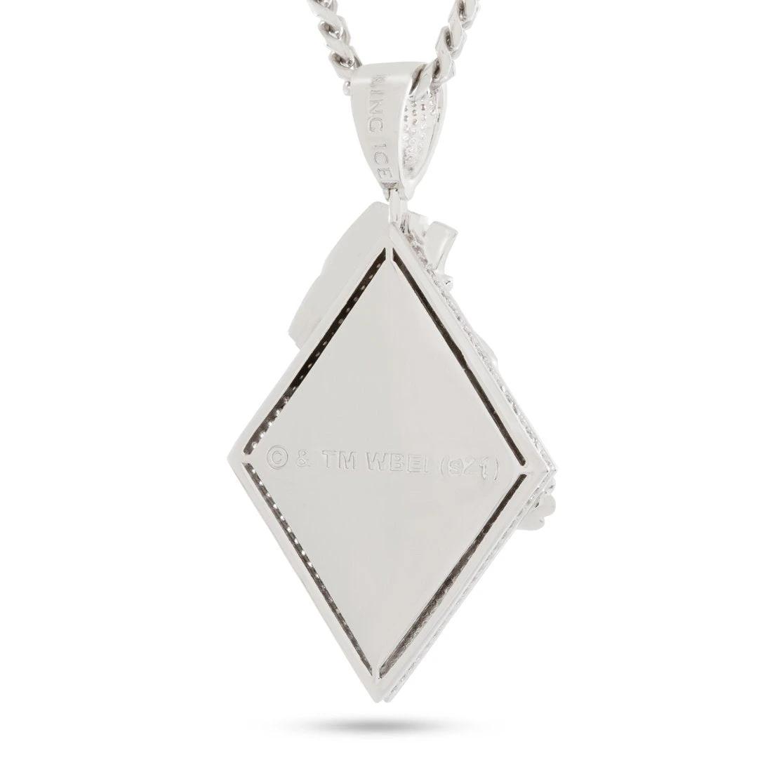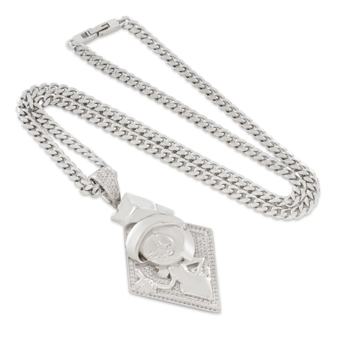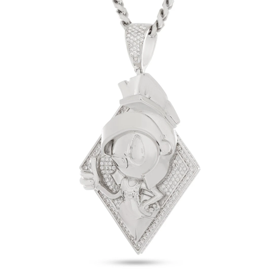 King Ice’s official Space Jam jewelry line collab features the entire lineup of diamond-shaped character pendants. Each character is embossed, polished, and pops against an iced background in a two-layer design that maintains a minimal look while retaining all the details of the character. Marvin the Martian is presented in full detail with an oversized design and an iced bail.