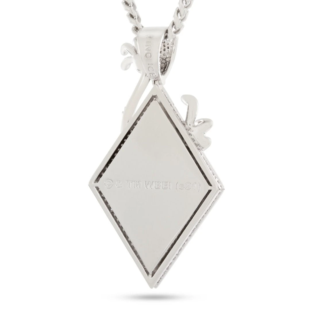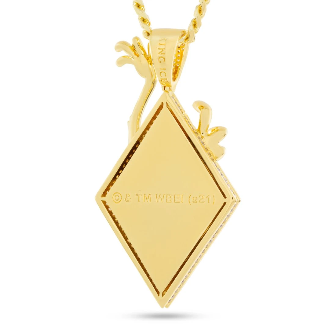 King Ice’s official Space Jam jewelry line collab features the entire lineup of diamond-shaped character pendants. Each character is embossed, polished, and pops against an iced background in a two-layer design that maintains a minimal look while retaining all the details of the character. Taz is presented in full detail with an oversized design and an iced bail.